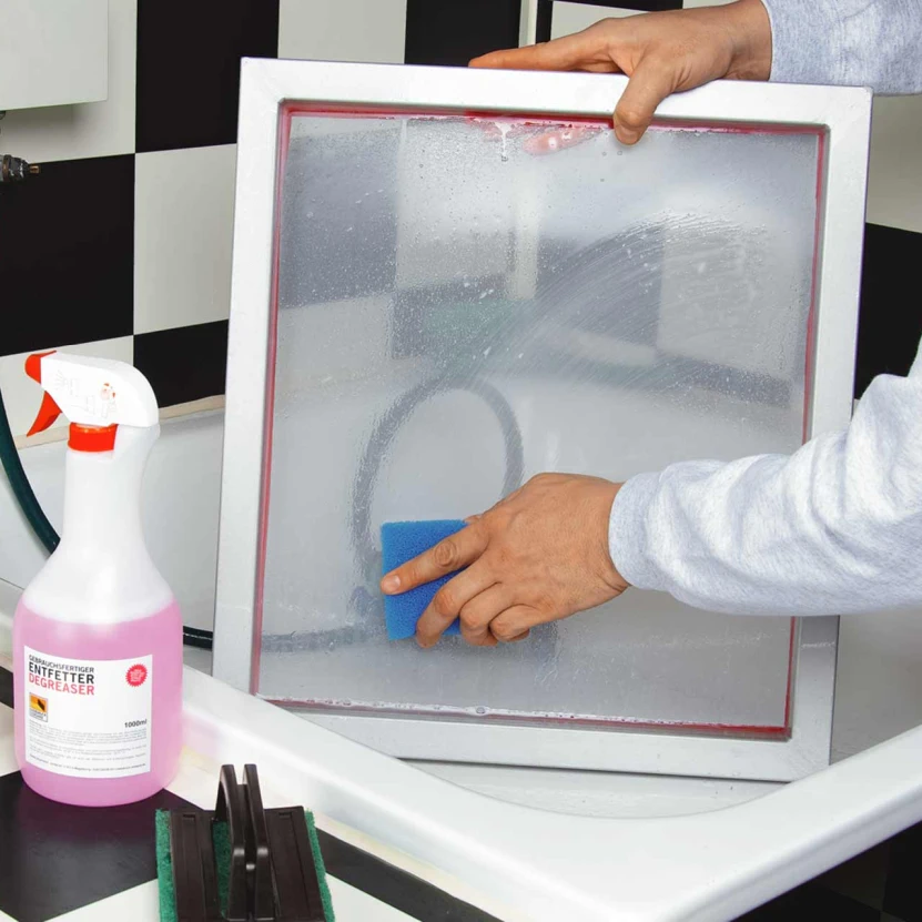 Before applying the emulsion, the screen must be thoroughly degreased because grease or dirt prevent proper adhesion of the emulsion. Use a special cleaner made for screen printing, apply it to the screen and let it act briefly, then rinse thoroughly with water. After degreasing, let the screen dry in a clean, dust-free environment. Proper preparation ensures the emulsion layer will be even and strong, which is crucial for stencil accuracy and durability. Don’t skip this step, as any grease can cause printing problems even after exposure.