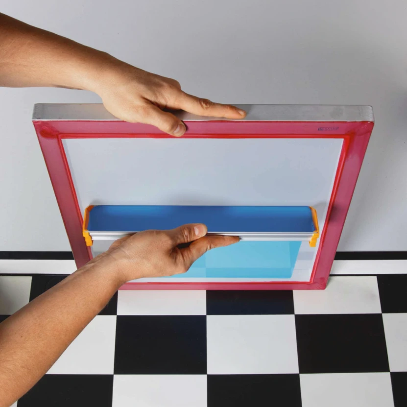 Apply ink to the upper part of the screen in sufficient quantity. First, spread the ink evenly and “fill” the motif without much pressure. Then, using a squeegee, press the ink through the screen and transfer the motif onto the substrate. The squeegee should be medium-hard to push the ink correctly but not damage the screen. Move the squeegee smoothly and evenly. After printing, slowly lift the frame and let the printed material dry. It is advisable to first apply spray or liquid adhesive on the printing board to prevent fabric or paper from sticking to the screen.
