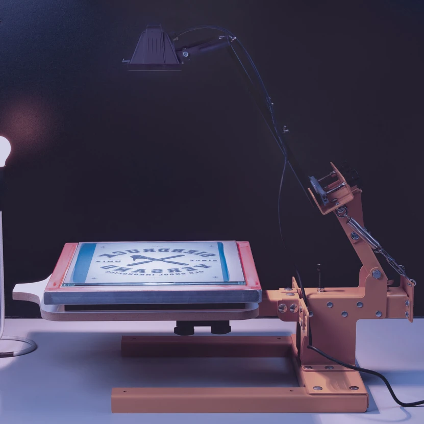 Place the transparent film with the motif onto the dry emulsion and ensure firm contact. Use a lamp with sufficient power and expose for 3 to 5 minutes, depending on the emulsion thickness and lamp power. The light hardens the emulsion where it is transparent and leaves it soft where the film is dark. After exposure, let the screen rest briefly, then proceed with developing the motif. Correct exposure is crucial for stencil cleanliness and durability, so it’s better to perform several tests.