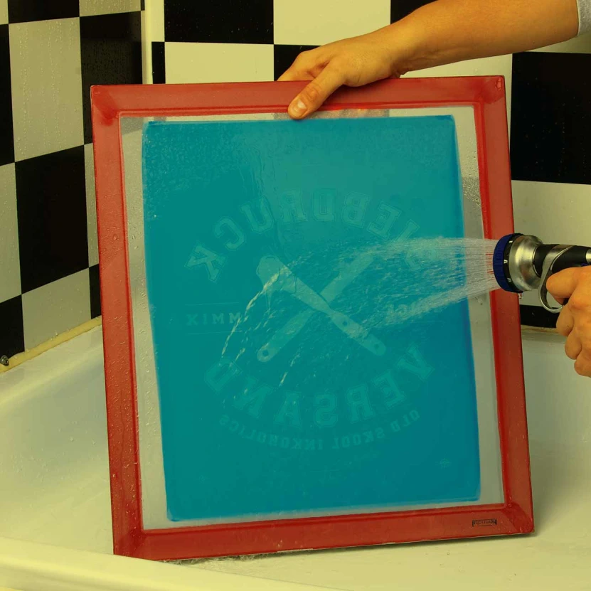 After exposure, rinse the screen with lukewarm water to dissolve the “unexposed” emulsion in the motif areas, creating open areas for the ink to pass through. Use medium water pressure to avoid damaging details. After rinsing, the motif will appear as transparent areas on the mesh. Small imperfections can be fixed with a brush and some emulsion, which can then be re-exposed. After developing, let the screen dry and check that the motif is clean and free of emulsion residues.