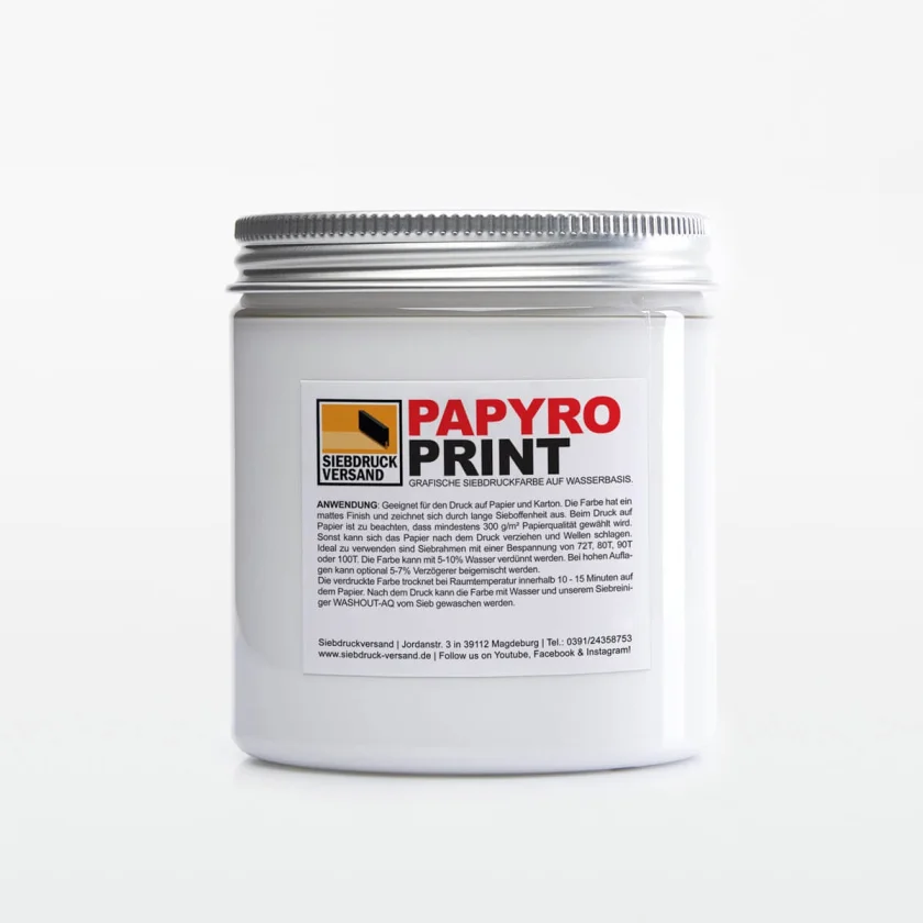 All shades can be mixed with each other as desired. To create translucent, transparent colors, colored colors can be mixed with the colorless binder PAPYROPRINT . Opaque white is usually used for tinting and mixing pastel shades. Prints with PAPYROPRINT inks have a matte surface. If a glossy surface is required, the print is overprinted with the transparent colorless varnish PAPYROPRINT .Comment