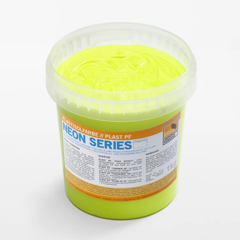 PLAST PF colors perfectly cover dark and black textiles. Only fluorescent neon colors and CMYK colors are generally less opaque. If you want to print on dark fabric, you must first underprint with white FLASHWEISS .