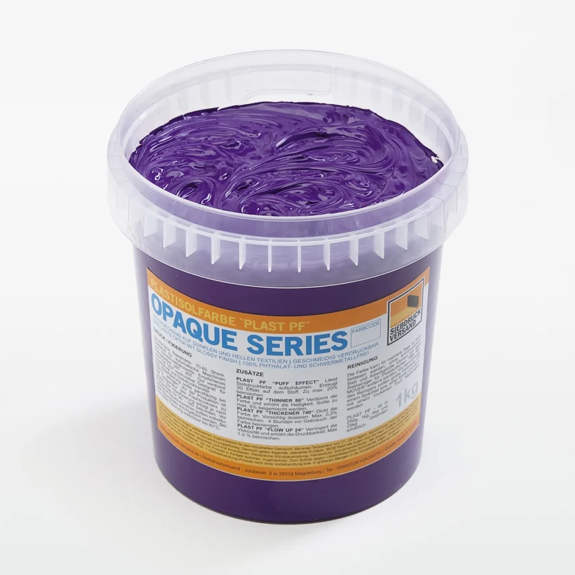 PLAST PF colors perfectly cover dark and black textiles. Only fluorescent neon colors and CMYK colors are generally less opaque. If you want to print on dark fabric, you must first underprint with white FLASHWEISS .