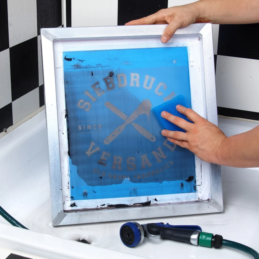 After the printing is finished, the rough paint residues are first removed with a suitable spatula. Kitchen towels, an old t-shirt or a dry cloth are then used to soak up the coarse paint residue. Alternatively, the paint can also be roughly rinsed with water in the bath. After that, a cleaner is applied to both sides and the remaining paint is wiped off the fabric in a circular motion. After the paint has completely dissolved, the sieve is rinsed with clean water. Always shake the bottle of cleaner thoroughly before use.