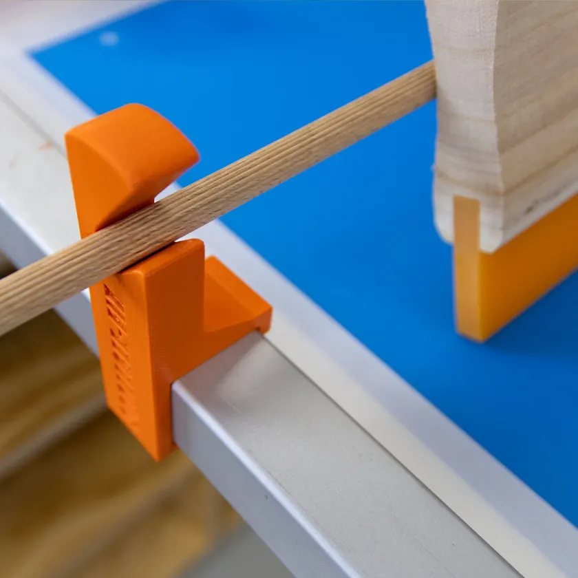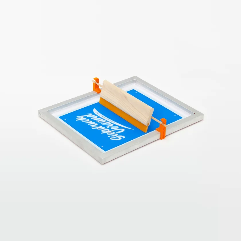 The squeegee holders are simply attached to the left and right edges of the frame and pressed into the desired position. The clamps are suitable for all screen printing frames with a frame format of 51 x 46 cm and 61 x 51 cm and all other screen printing frames with a frame profile of 3 x 3 cm. The set consists of two plastic clamps and a wooden rod.