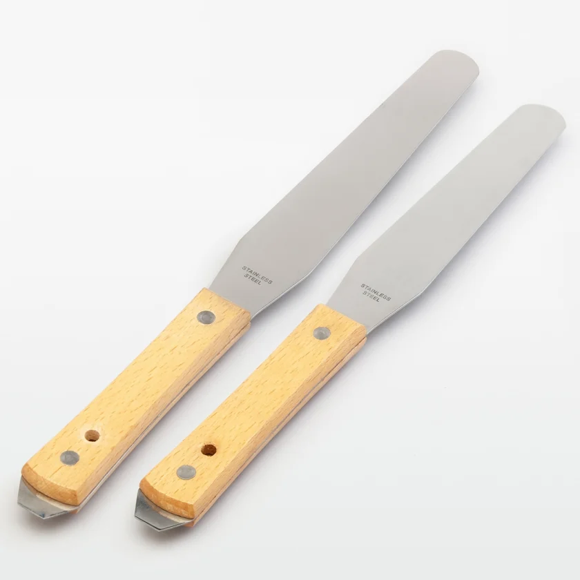 Specially designed paint spatulas for mixing and targeted application of screen printing ink. The shape of the blade with a thickening towards the tip allows you to work at a flat angle, which results in a very thin layer of paint. The blade is made of chemically resistant stainless steel, which is easy to maintain. The rounded edges prevent damage to the fabric during work. The wooden handle is ergonomic and fits comfortably in the hand even during prolonged work.