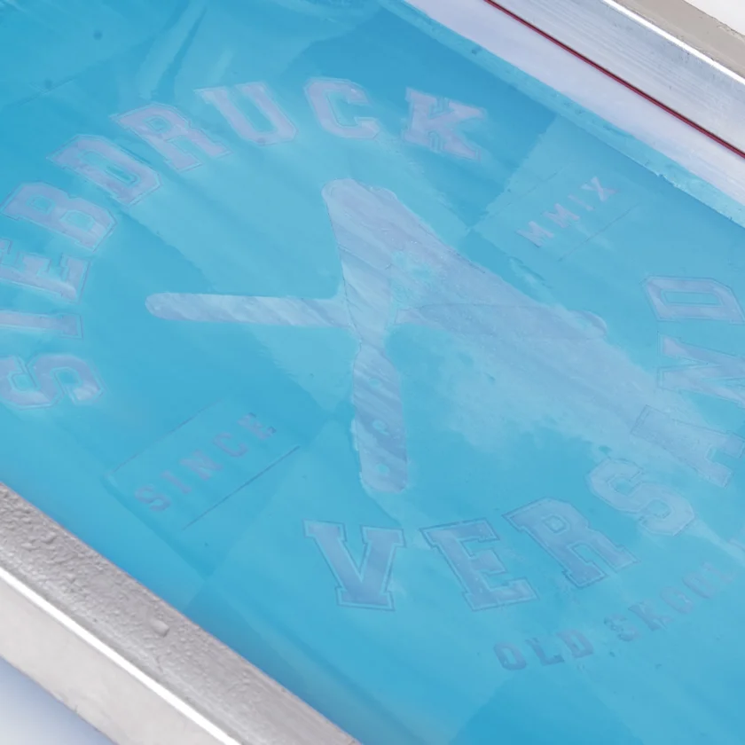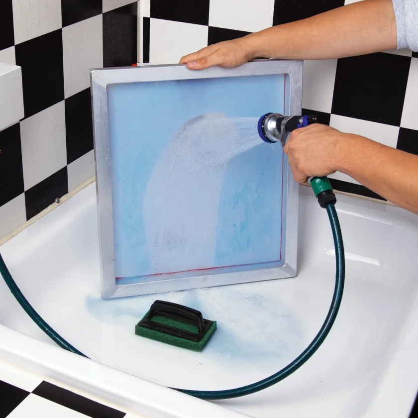 a sieve cleaner . In this way, the agent can act directly on the emulsion. The ready-to-use peeler is then liberally applied to both sides of the screen using a spray pump. After 3-5 minutes of action, it is recommended to remove the softened emulsion with a rough sponge. The sieve must then be rinsed with a strong stream of water (ideally with a high-pressure cleaner). When using, make sure that the peeler does not dry on the fabric. It should be washed off the fabric after the recommended exposure time of 3-5 minutes at the latest.