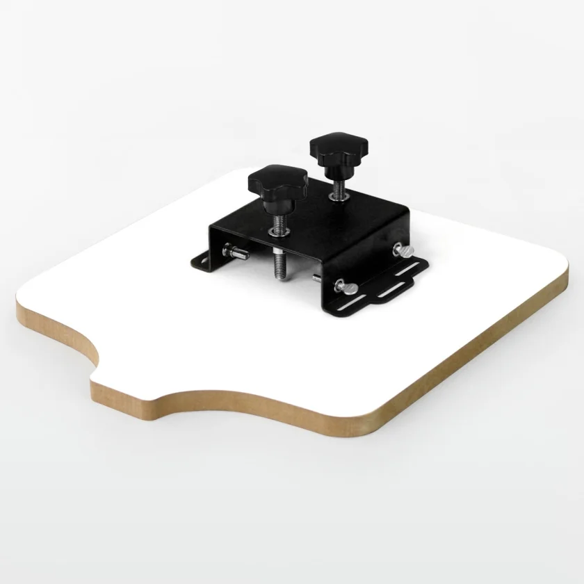 If you want to print textiles professionally, you need a printing plate of the right size. Our screen printing machines are equipped with a 55 x 45 cm plate as standard. If you intend to print on smaller XS t-shirts, bags or baby clothes, you need special plates for this. Pressure plate hangers are required to attach these plates to the machines. So this suspension is the connecting piece between the board and the machine.
